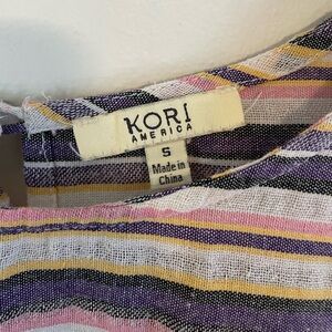 Chic striped dress with ruffle sleeves. Features a playful design with multicolor stripes. Size S.