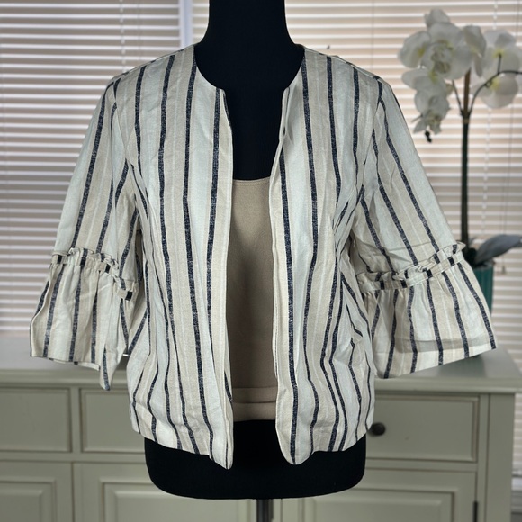 Chic open-front jacket with ruffle sleeves. Perfect for layering. Stylish striped pattern.