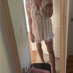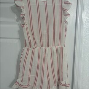 Chic romper with red stripes and ruffle sleeves. Perfect for casual outings.