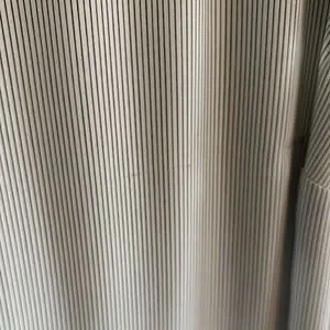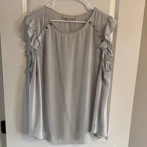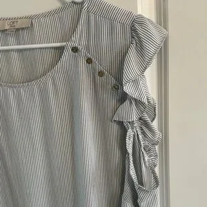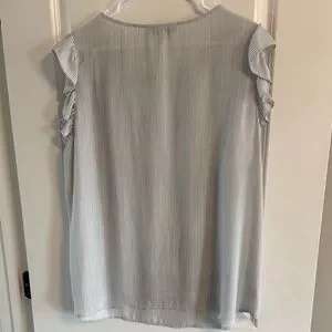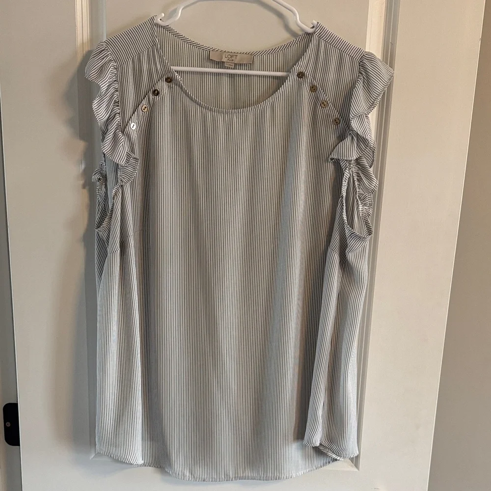 Stylish pinstripe blouse with ruffle sleeves. Button accents add charm. Ideal for versatile wear.