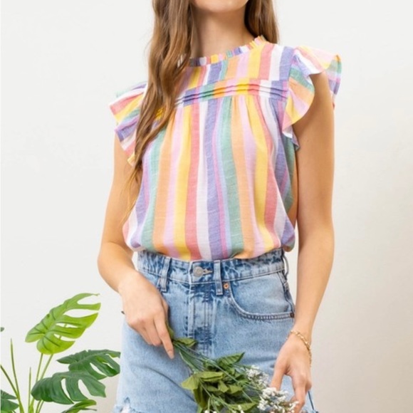 Super cute striped top with ruffle sleeve detail. Runs small.