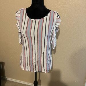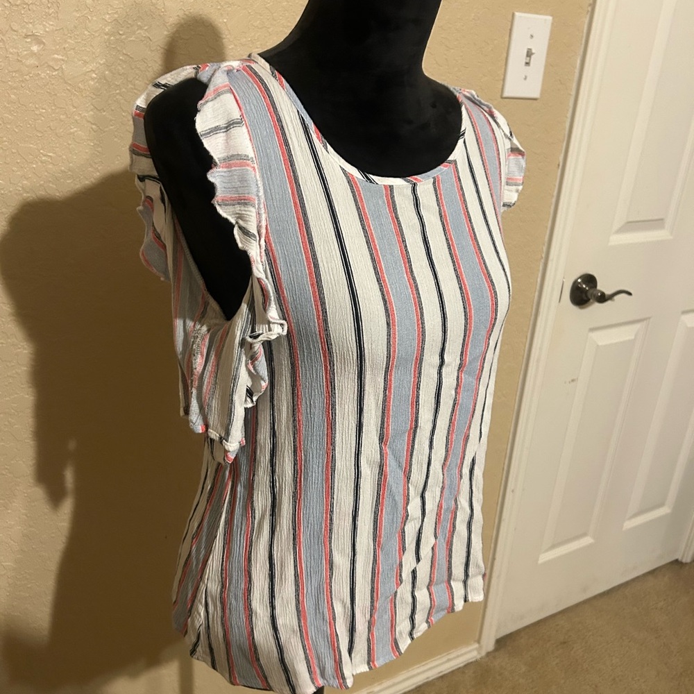 Chic and stylish, this striped ruffle sleeve top is perfect for any occasion. Featuring a blend of red, blue, and white stripes, ruffled tank top medium