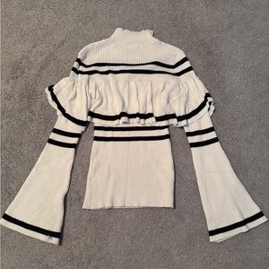 Black and white striped sweater with mock neck and bell sleeves, size small, John + Jenn
