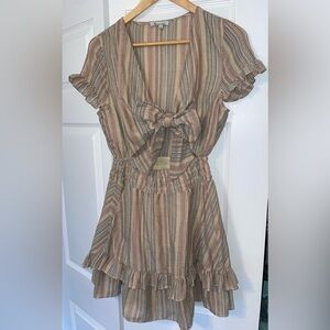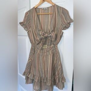 Chic striped dress with ruffle details and a tie-front design.