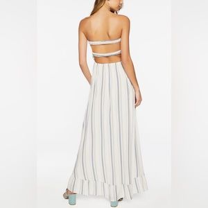 A woven maxi dress featuring an allover striped pattern, strapless design, straight-cut neckline and back, smocked bodice, caged open-back with support straps, and a ruffled high-low tulip hem.