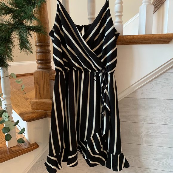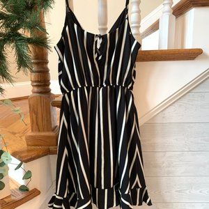 Striped Black and white riffled romper. Wrap around disguises as a mini dress. Size small