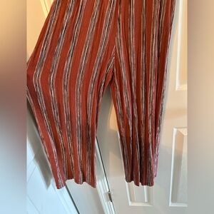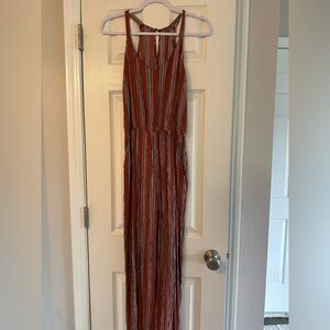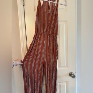 Elevate your style with this chic striped rust jumpsuit. Perfect for any occasion, it offers comfort and elegance. Used and in great shape.