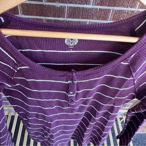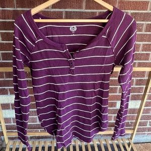 SO brand thermal, size XS and relaxed fit. The color leans more purple than red, with white stripes. 3 functional metal buttons. Comfy and soft!