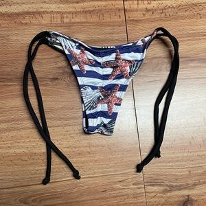 Bikini bottom with side tie in striped sea shell & star fish print. Also has ruched back which helps create a bubble-butt illusion, enhancing your bootie’s curves. Bikini bottom is lined in the front and back.