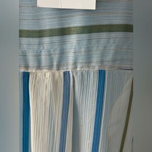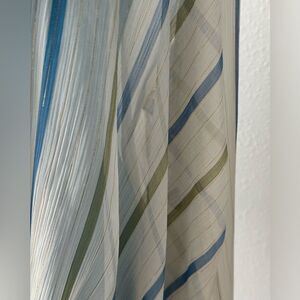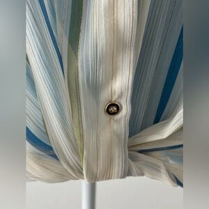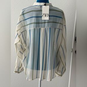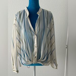 Elevate your wardrobe with this elegant sheer blouse. Featuring a stylish blue and cream stripe pattern, it's perfect for any occasion. Pair it with your favorite jeans or skirt for a chic look.