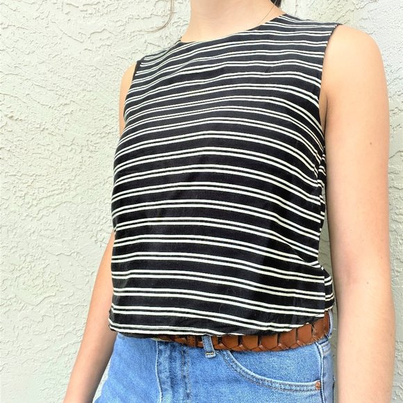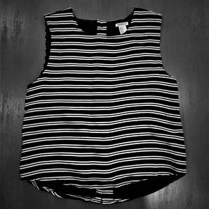 Black and white striped shell tank. Perfect length to wear with high waisted pants. The top is slightly tight on the model and should have a boxier more structured fit. This top would look nice on someone more petite.