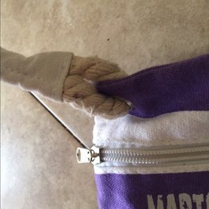 This is a purple and white striped shoulder bag with two pockets and a comfortable rope as the string. It says Martha's Vineyard on the front and nothing on the back.