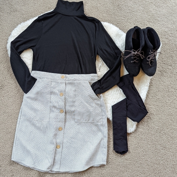 Black & White striped skirt with faux button front. Large pockets in front Back of waist is elastic **Black turtleneck sold in other listing**