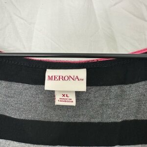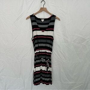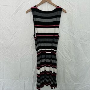 Chic sleeveless dress with black, gray, and pink stripes. Perfect for casual outings.