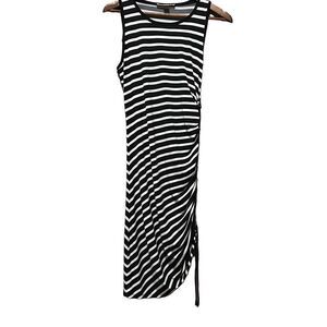 Striking style radiates from this striped midi dress, perfect for elevating your everyday look. The classic black and white stripes create a timeless appeal, while the sleeveless design ensures comfort and breathability. A chic ruched detail on the side adds a touch of sophistication and creates a flattering silhouette. This dress also features a side slit, adding a hint of allure and ease of movement. Perfect for a casual brunch, a summer stroll, or a relaxed evening out with friends, this dress is sure to become a versatile staple in your wardrobe.