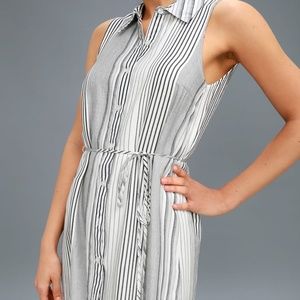 This breezy black, white and blue sleeveless dress features a collared neckline and tying waist sash. NWT