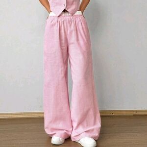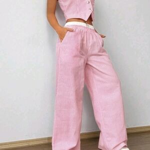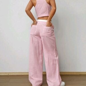 Striped Sleeveless V-Neck Front Button Top And Patch Pocket Pants Two-Piece Set