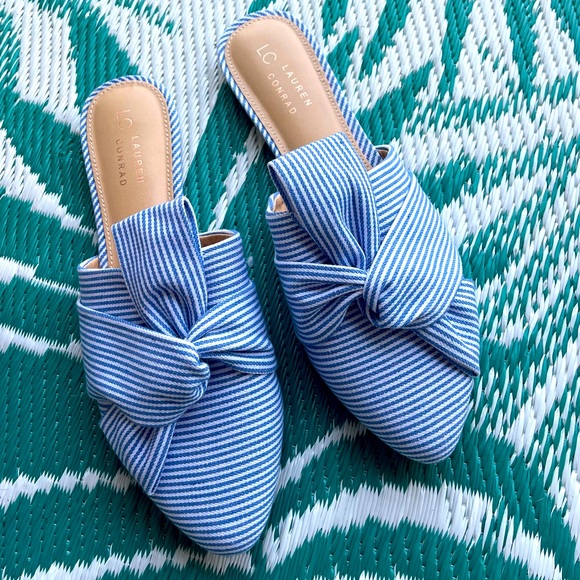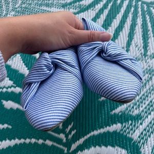 Brand new never worn blue and white striped slides! The perfect summer shoe, wear it with white jeans to elevate a look 💙🤍 it’s a cloth material.