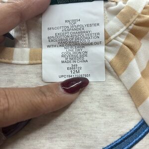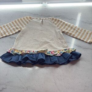 Adorable baby top featuring a sloth design. Striped sleeves and floral ruffle hem add charm. Perfect for a playful look.