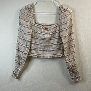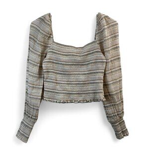 Striped Smocked Square Neck Crop Top With Long Balloon Sleeves In Neutral Stripe