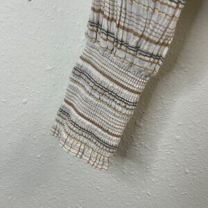 This delicate piece embodies the perfect fusion of romantic and contemporary styling. The smocked bodice creates a flattering fitted silhouette while the square neckline adds a classic touch. The long balloon sleeves with gathered cuffs provide dramatic volume, while the cropped length hits at the perfect spot above the waist. The neutral striped pattern in cream, tan and black offers versatile styling potential for multiple seasons.