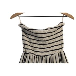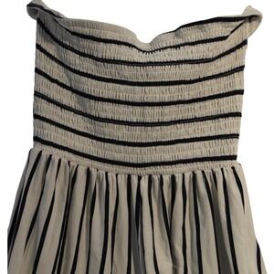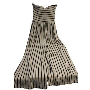 Striking strapless jumpsuit in a neutral color with bold, black vertical stripes. Features a smocked bodice that ensures a snug and flattering fit, transitioning to a breezy, wide-leg silhouette for ultimate comfort and style. Includes delicate spaghetti straps that can be worn or tucked in for a true strapless look. Perfect for a beach vacation, a casual summer outing, or a stylish day event.