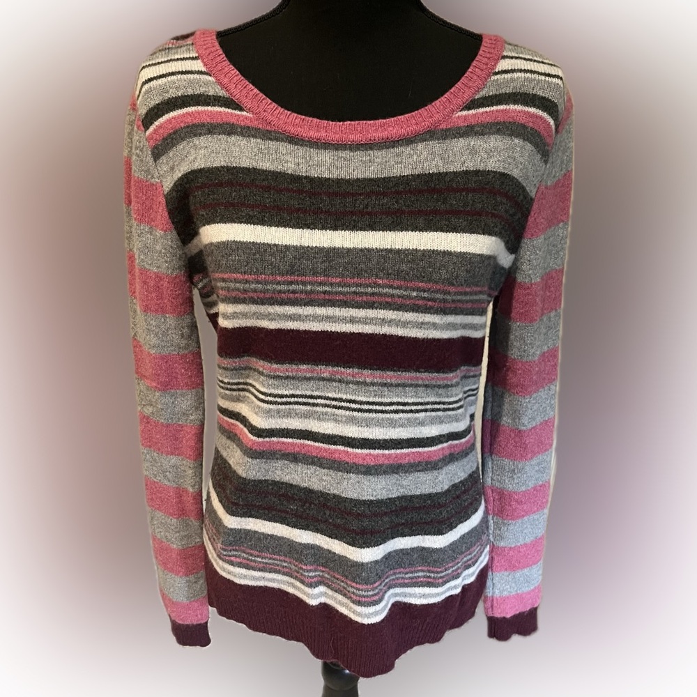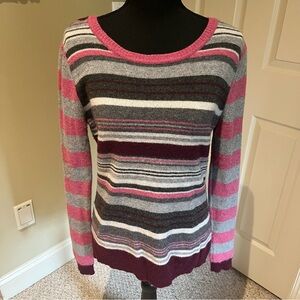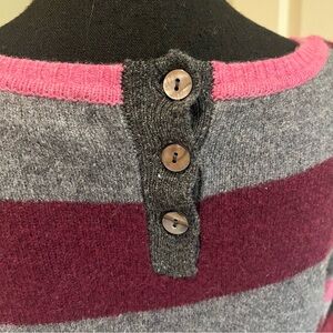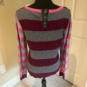 Striped pink, magenta, maroon, white and grey sweater, size large with button detail on back