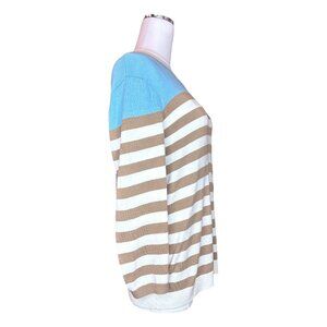 Elevate your wardrobe with this charming striped knit sweater by Talbots. Featuring a classic tan and white stripe pattern with a sky blue yoke, this cozy pullover adds a refined nautical touch to any outfit. The unexpected back-button detail makes it perfect for work, weekend, or travel style. Lightweight and breathable with a relaxed silhouette for easy layering and transitional wear.