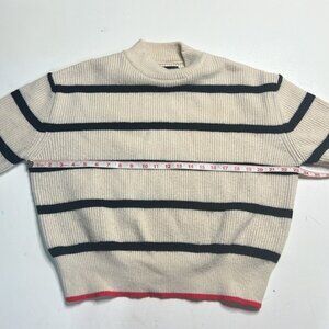 Cozy sweater with bold black stripes. Red trim adds a pop of color. Perfect for casual wear.