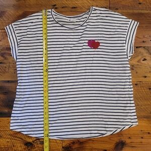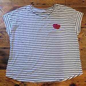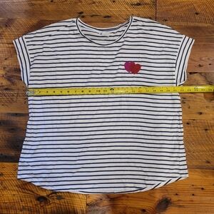 White and navy striped t-shirt featuring a red and pink double heart patch. Size XL from Cynthia Rowley.
