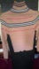 Striped Tan Turtleneck Sweater with designer like red white black stripes, size medium. Ribbed cotton material, good condition.