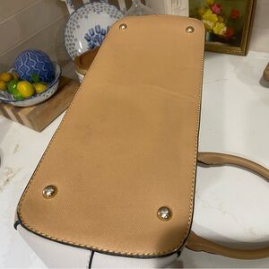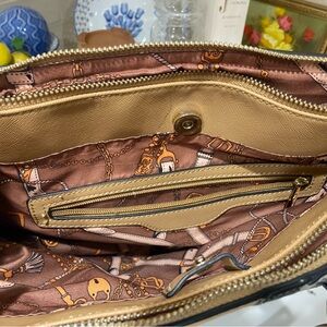 Elegant women's handbag featuring a stylish striped design in tan, black, and white. Perfect for any occasion.