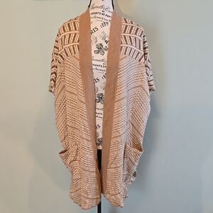 Cozy cardigan with striped pattern. Features tan and cream colors. Perfect for layering.