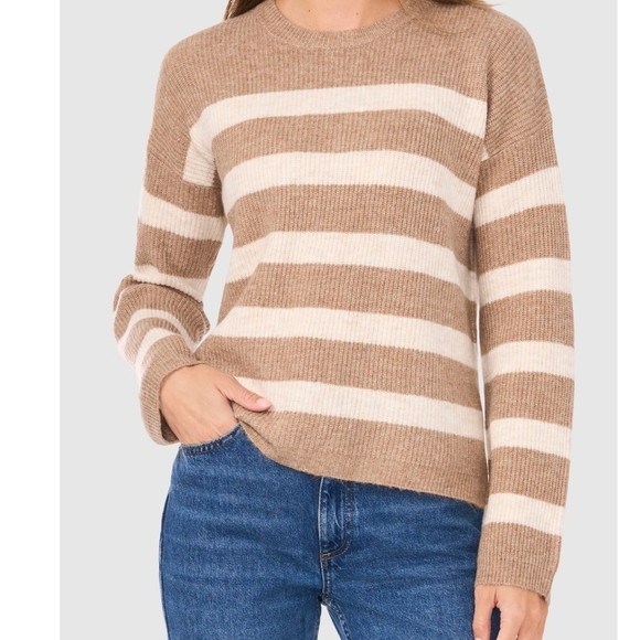 Stay cozy and stylish with this striped tan and cream sweater. Perfect for any casual outing. Lightweight acrylic/nylon blend