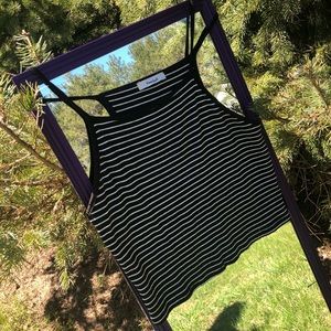 Cropped fit. Soft, ribbed material. Very comfy! Only worn a couple times, in good condition.
