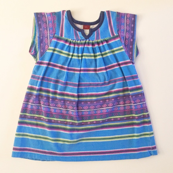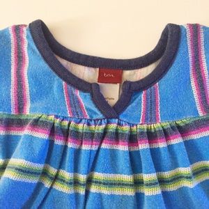 Adorable knit dress has your little girl ready for school and play! Teal, purple and green striped pattern; v-neck with piping. Tea Collection. From smoke-free home.