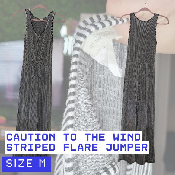 Soft black-and-white striped patterned jumpsuit with flared legs and a false tie-front.