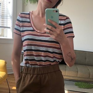 Size XS Madewell striped top. 62% cotton and 38% polyester. This light weight top has a deep scoop neckline and textured feel. Fits true to size. Original price $39.50. Colors: Baby blue, navy blue, mauve and peach.