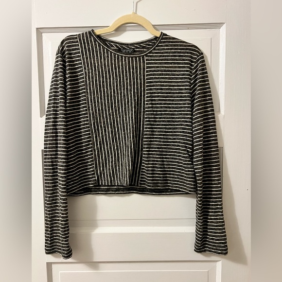 Striped top, would say this is between a regular and crop top for length. Only worn once. Size 8, fits like a size S-M