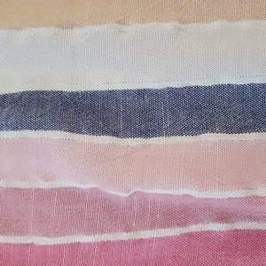 Lightweight striped top with v-neck and ruffle detailing at sleeve. Thin silver metallic thread detail in stripes (see pic).