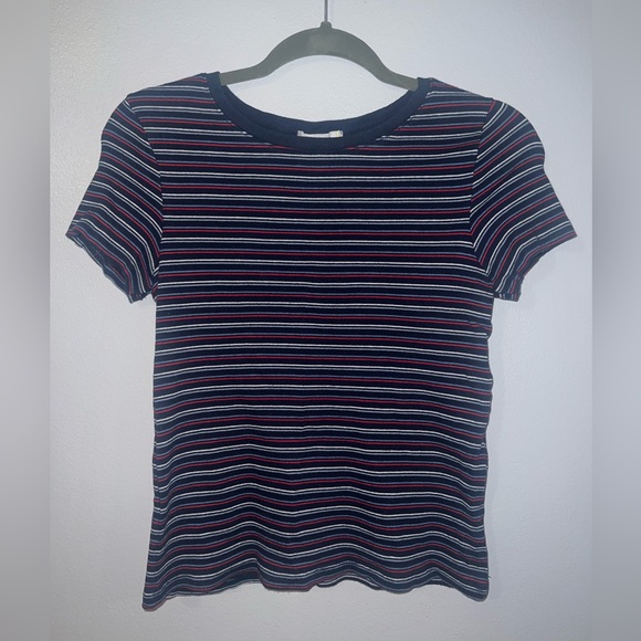 red blue and white striped top