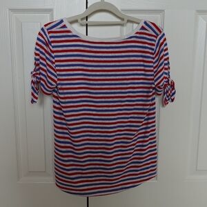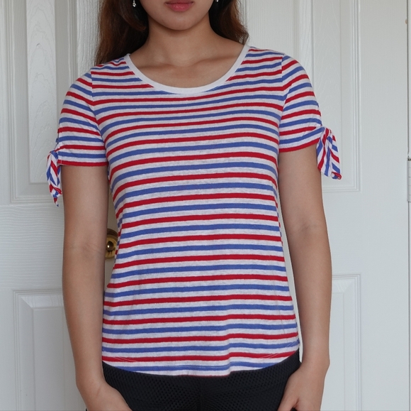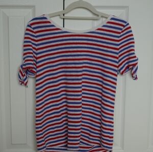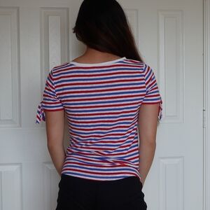 - red, white, and blue stripes - keyhole sleves model is 5'4"