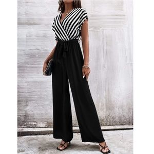 Striped Top V-Neck Surplice Short Sleeve White Black Wide Leg Jumpsuit