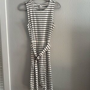 Chic and stylish, this sleeveless dress features a classic black and white stripe pattern. Perfect for any occasion.