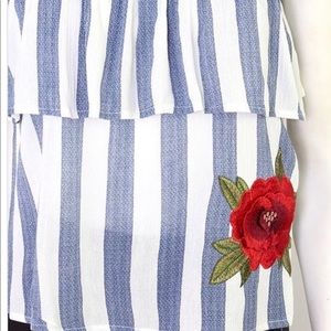 Strapless neckline blue and white striped tube top with red rose embroidery. Flowing fabric.