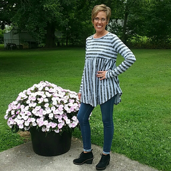 French Terry Striped Long Sleeved Baby doll Tunic. 100% Cotton. Made in the USA. Model is wearing a small.