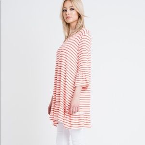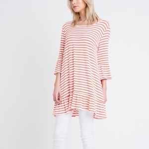 3/4 sleeve striped + ribbed knit tunic top with ruffled sleeves and ruffled hem.
