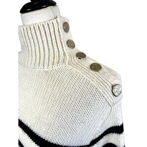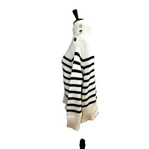 Classic stripes meet chic details in this cream and black striped turtleneck sweater with bold shoulder button accents. The slightly oversized fit and ribbed knit give off effortless Parisian street style and coastal granddaughter vibes. Perfect with jeans and loafers for a casual day or wide-leg trousers for a polished look.