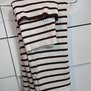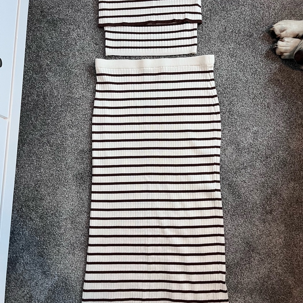ribbed two-piece set cropped top and skirt with chocolate brown and cream stripes. Skirt hits mid calf, with small slit in back of skirt. Never worn, took off tags and couldn’t return