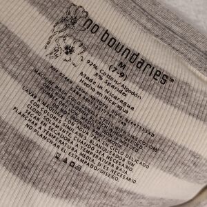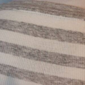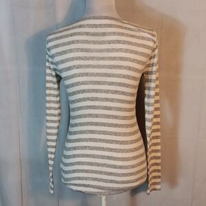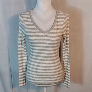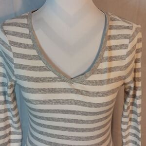 Elevate your casual wardrobe with this stylish striped V-neck long sleeve top. Size Medium (7-9) with a pit to pit measuring 18" and a length of 26". Perfect for any occasion, this top offers comfort and a chic look.